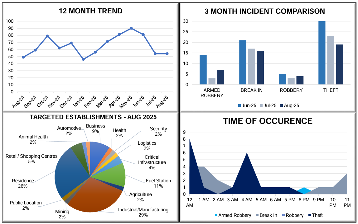 Theft, 13 August 2025, 2358hrs, Shurugwi, Gweru, Midlands – The on-duty guards reported that, while conducting routine patrols, they observed three unknown intruders fleeing the premises carrying approximately 30 metres of stolen razor wire.