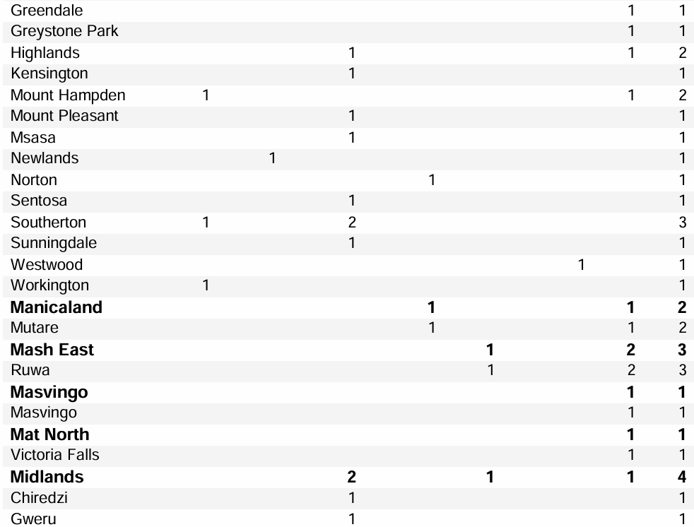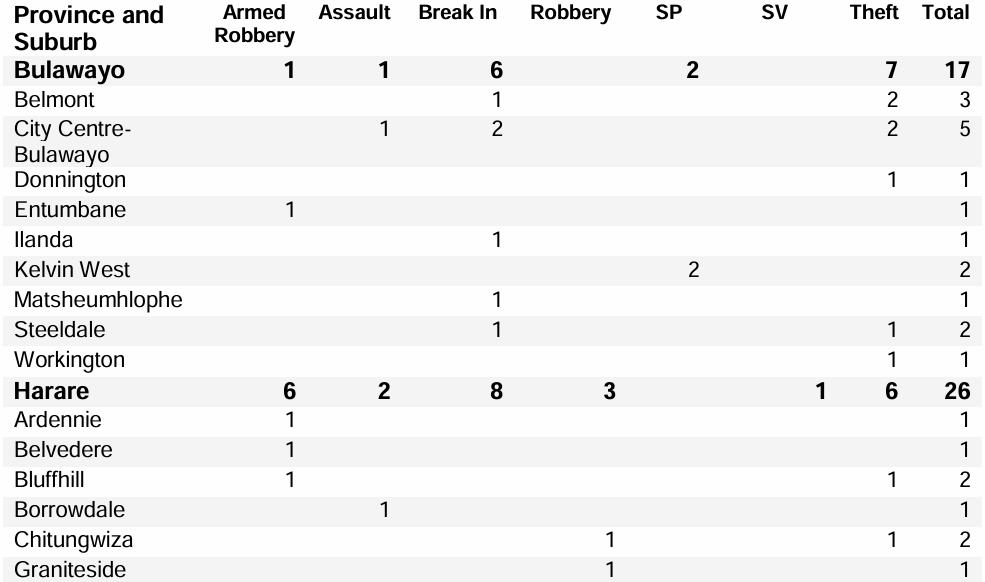 Note: The incidents and statistics we report are those that we have verified. This report is a good indicator of crime across the country but by no means captures all incidents. For more information on the crime in your area or to share verified cases of crime, please contact us at byoanalyst@safeguard.co.zw.