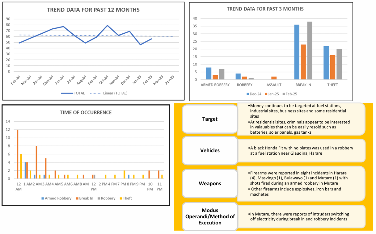Armed Robbery, 25 February 2025, 0250hrs, Seke Road, Graniteside – Harare: A response team was dispatched a panic signal was received from the site. On arrival, the team reported that intruders armed with a firearm, iron bars and machetes attacked the private security guards and fuel attendants. The intruders forced their way into the cash office and used explosives to blow open the safe.
