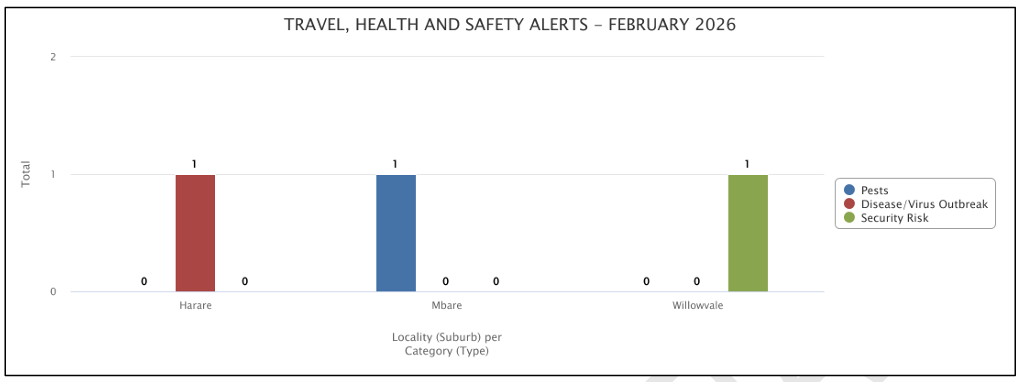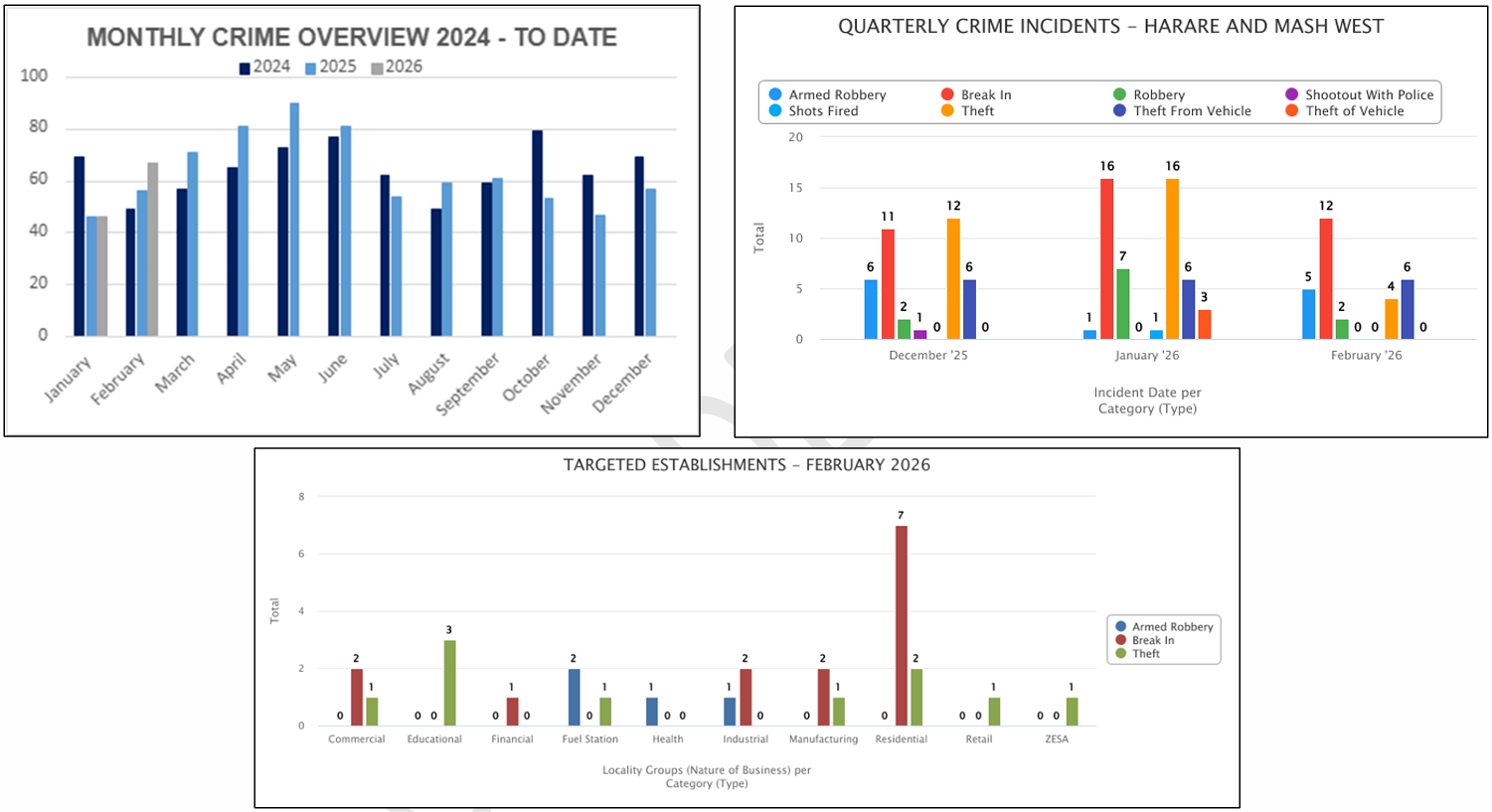 • Money and easily resalable goods remain the primary targets across residential, commercial, and industrial premises. Although the reports of vehicle theft decreased, vehicles remain vulnerable. In Pomona, a vehicle was stolen during an armed robbery in Pomona, Harare.
