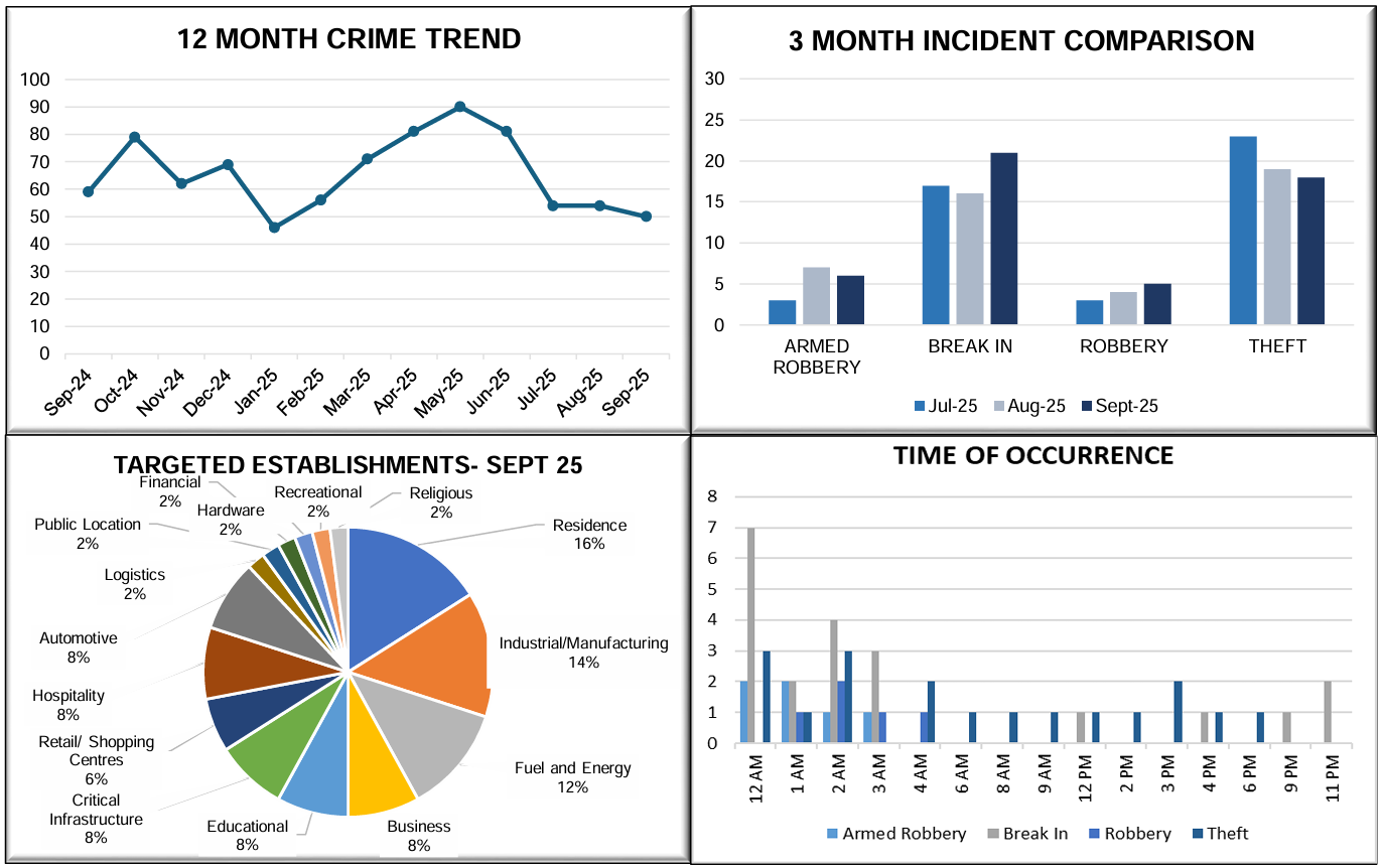 50 incidents were recorded across our client network nationwide (−7% vs. August). Harare remains the primary hotspot, with thefts and break-ins predominating, while armed robberies, though fewer, continue to pose a significant risk.