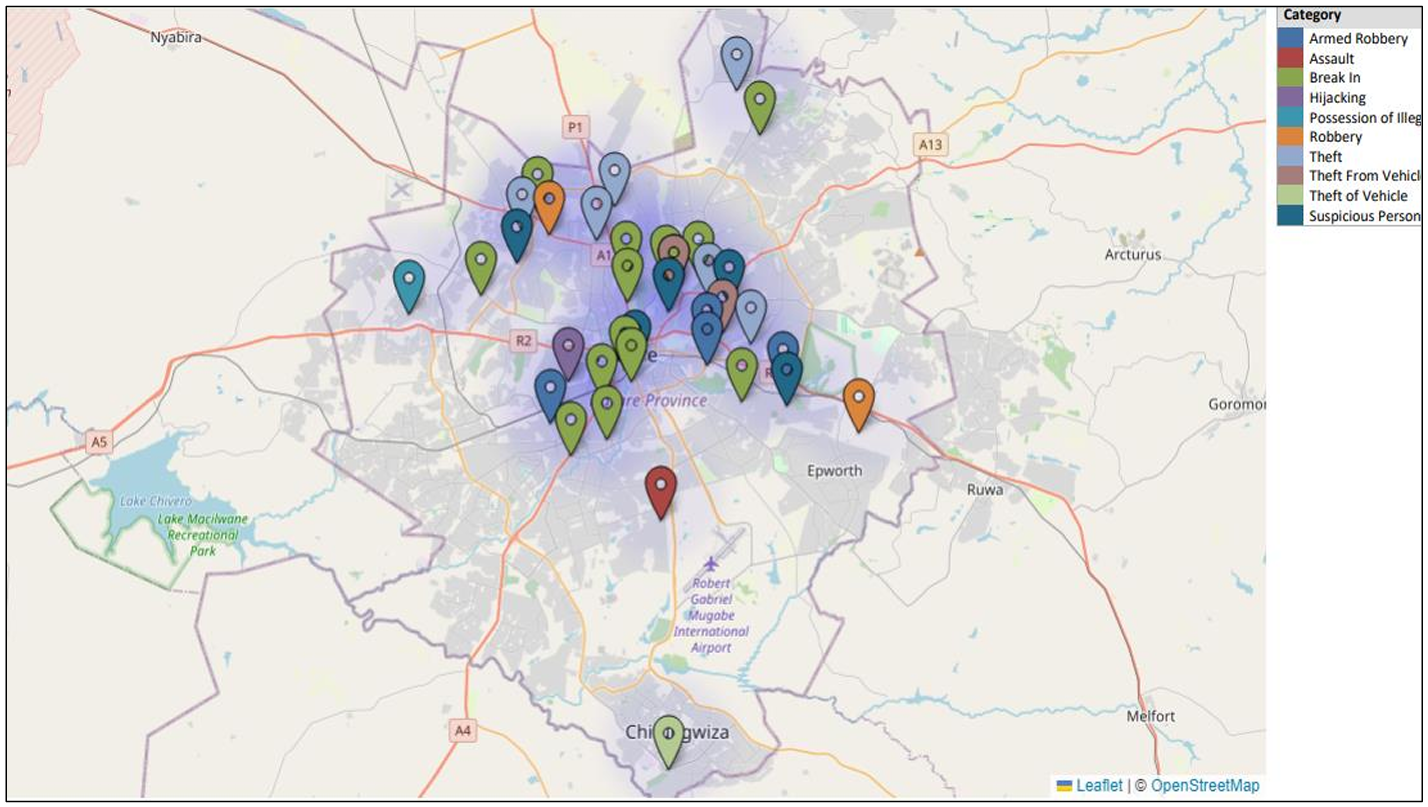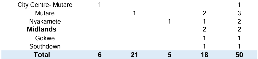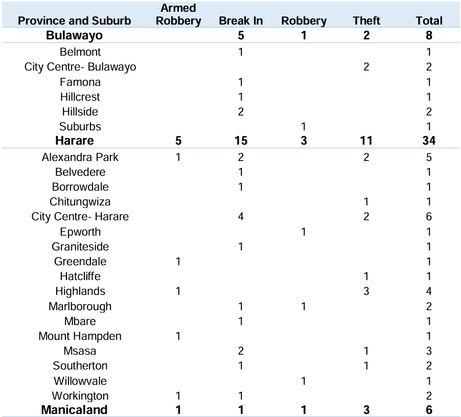 • In Harare the highest concentration of incidents was recorded in the City Centre with most involving lone suspects.