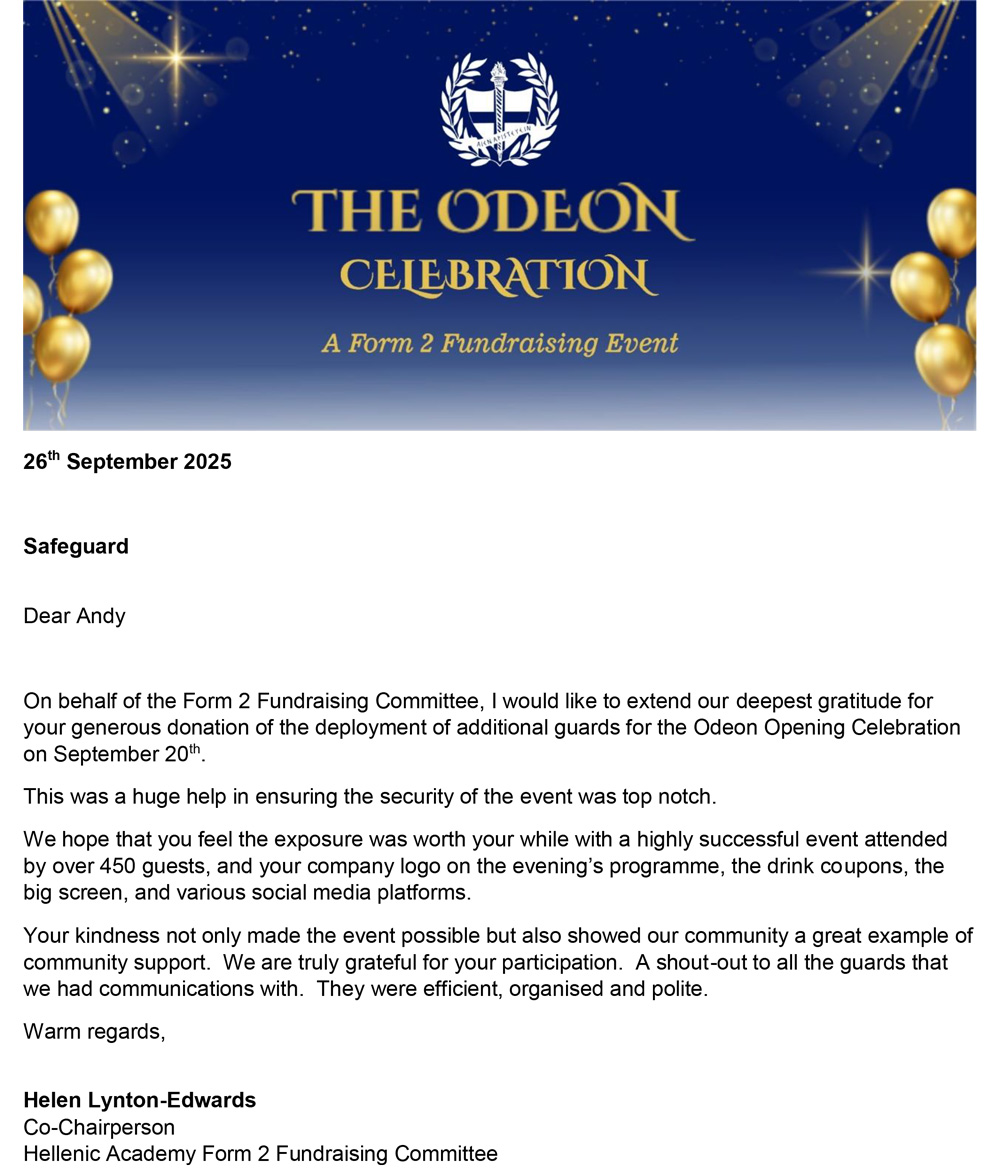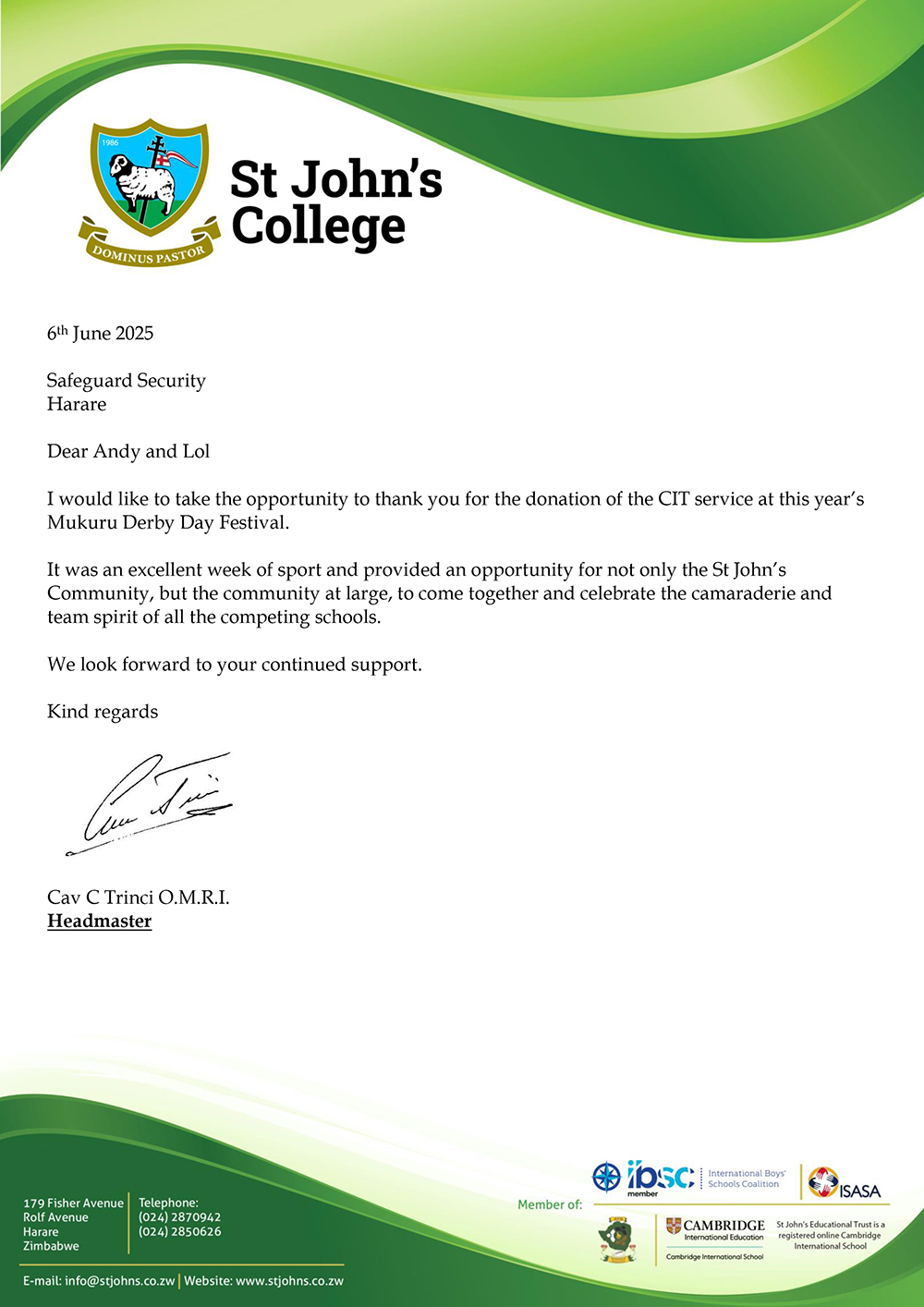 Following yesterday’s incident at Hellenic Primary School, I wanted to recognise the good work that the Safeguard team did to identify and deal with a suspicious vehicle. The vigilance and proactivity has the effect of increased confidence in our security provision. Equally, the arrest of the serial laptop thief on Hellenic grounds last term, after she had plagued a number of Harare schools brings solid kudos to your company.